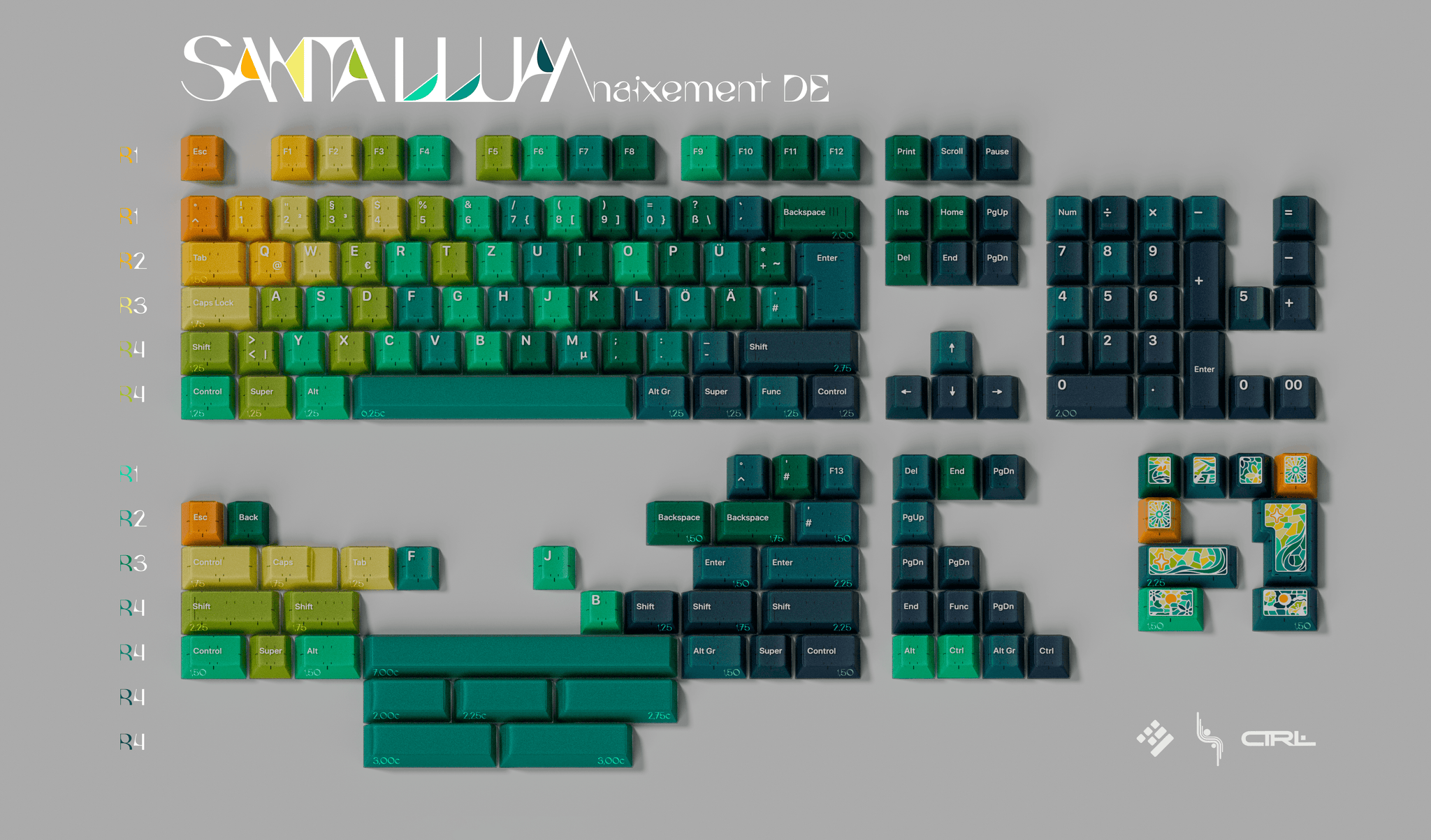 Die KAP Santa LLum (Naixement Base Kit) ISO-DE Keycap-Set ist ein künstlerisch designtes Custom-Keycap-Set von Keyreative, das von den farbenprächtigen Buntglasfenstern der Sagrada Família in Barcelona inspiriert wurde und das Erwachen des Tages in sanften Grün- und Türkistönen mit goldenen Akzenten einfängt. Mit seinem Cherry-Profil bietet es ein klassisch komfortables Tippgefühl, während die sorgfältig gestalteten Doubleshot-Legenden und UV-gedruckten Novelties lebendige, farbintensive Details liefern, die bei jeder Tastaturinstallation hervorstechen. Dieses Set richtet sich an Enthusiasten, die ein thematisch stimmiges, hochwertiges Keycap-Erlebnis suchen, und kombiniert visuelles Storytelling mit robustem Material und präziser Fertigung.